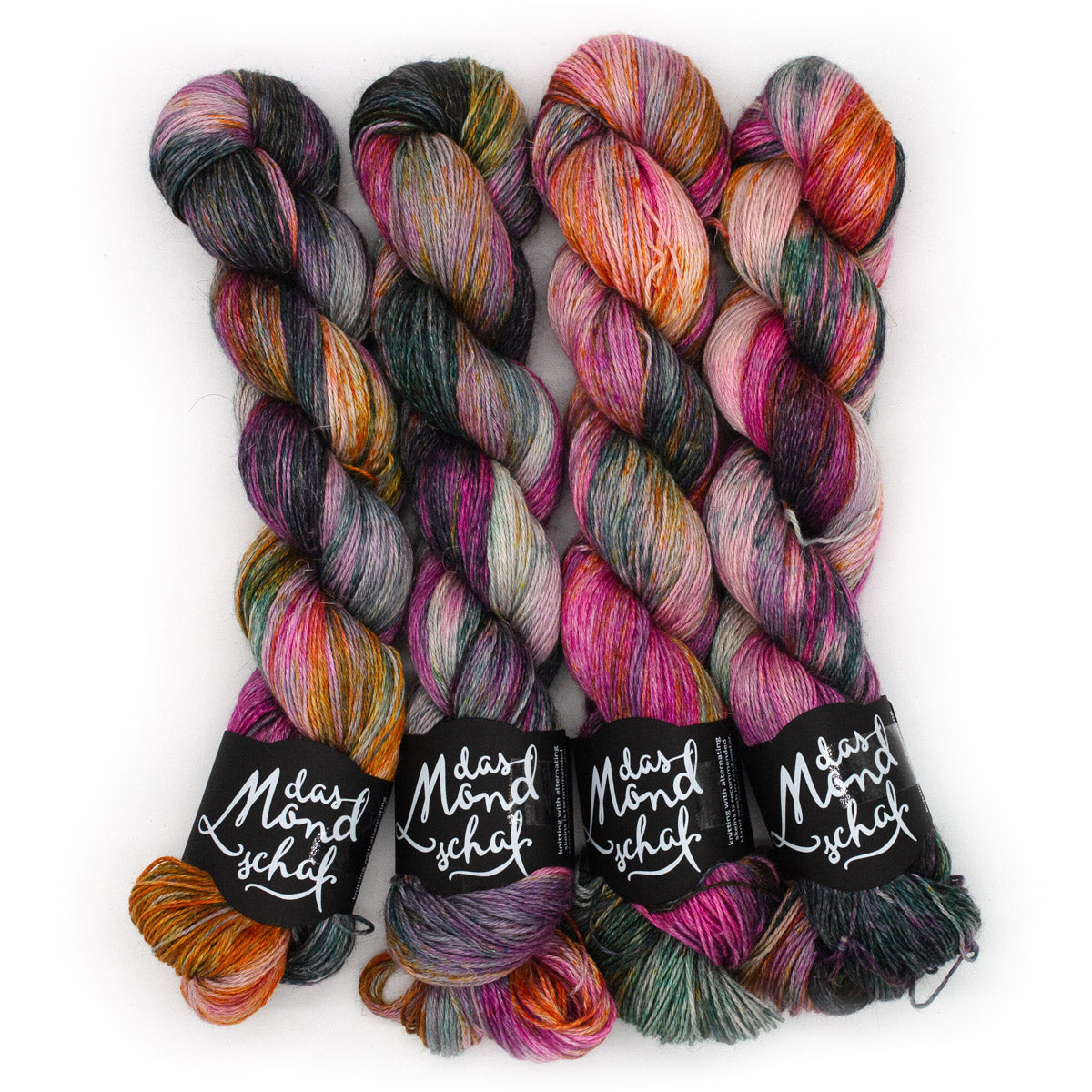 Handgefärbtes Garn aus 50% Alpaka 25% Seide und 25% Leinen.