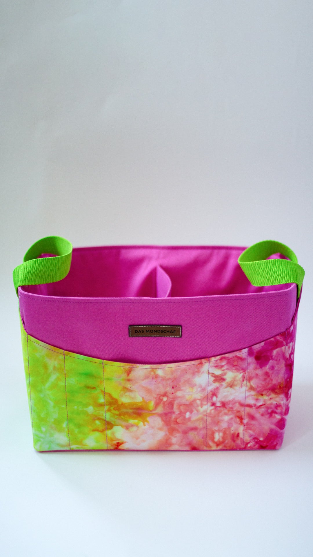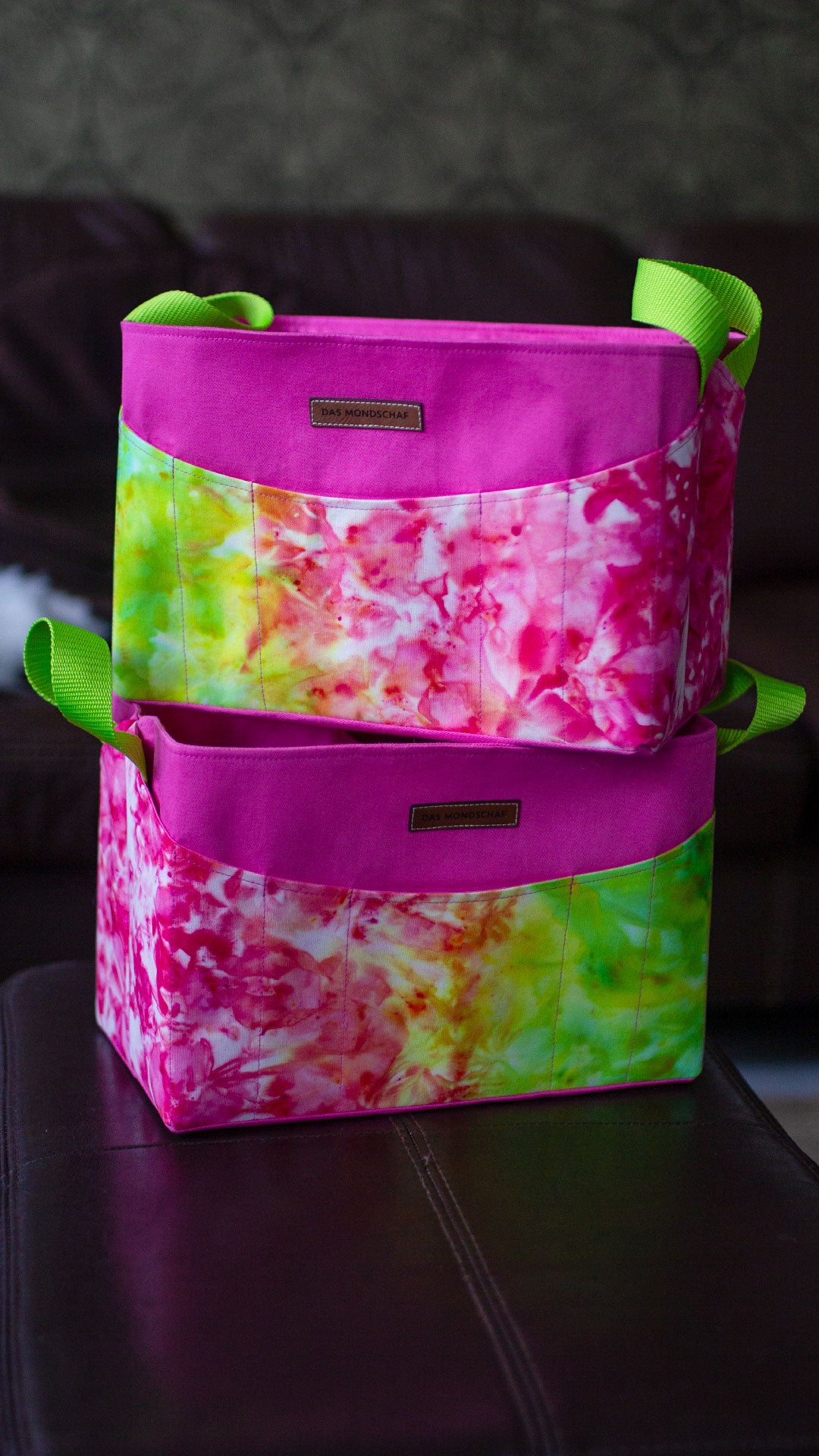 Die Außenseite der Körbchen besteht aus von uns selbst gefärbtem Baumwollstoff, deshalb gibt es jeden Beutel leider nur einmal.