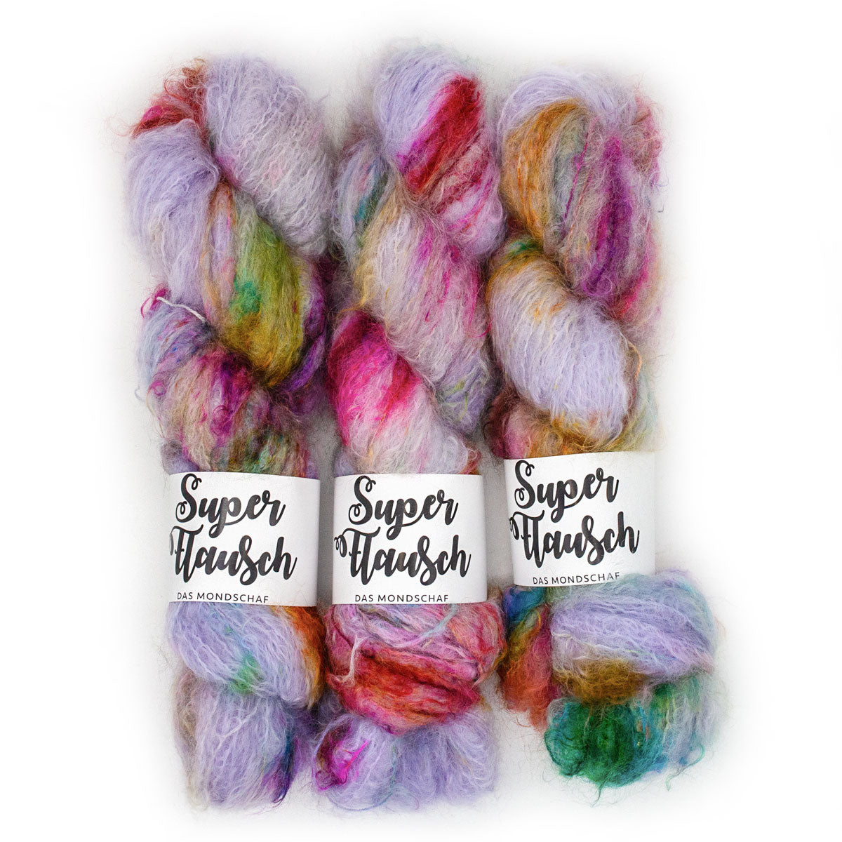 Wer Mohair mag, wird Superflausch lieben. Mit diesem Garn strickt ihr in Blitzgeschwindigkeit Schals, Pullover und Jacken für die kalte Jahreszeit. Wer es gerne etwas pompöser mag, kombiniert es mit „Alles Pailletti“.
